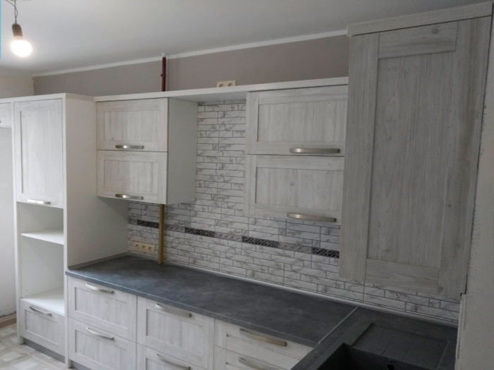 Кухня «Ромвина» выполнена из шпонированных деталей. При разборных фасадах получается соблюсти равномерность всех углов, что в итоге и придаёт строгость данному проекту. Тиснение, дерево и более 50 видов расцветок.